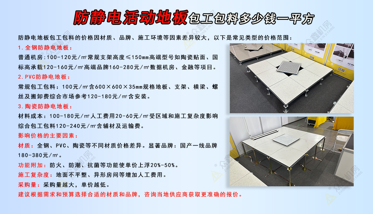 2025-12-08在机房、数据中心、金融机房等精密场景中,防静电活动地板是保障设备稳定、人员安全的核心基建材料。但 “防静电活动地板包工包料多少钱一平方”,始终是企业采购时的核心疑问 —— 毕竟不同材质、