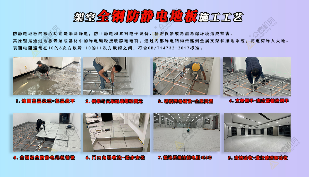 2025-12-08之前众鑫机房分享了防静电地板施工工艺,大家好像还是对施工不同明了,今天众鑫小编给大家讲一下详细的施工要求和施工工艺。一、机房防静电地板安装的施工要求机房地板一般采用防静电活动地板。防静电地板的作用,就是把地面上所产生的静电,通过防静电地板导