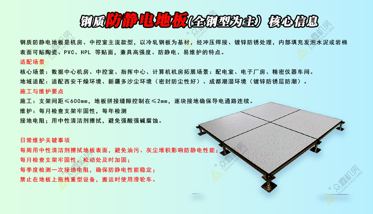 2026-03-20之前众鑫机房分享了防静电地板施工工艺,大家好像还是对施工不同明了,今天众鑫小编给大家讲一下详细的施工要求和施工工艺。一、机房防静电地板安装的施工要求机房地板一般采用防静电活动地板。防静电地板的作用,就是把地面上所产生的静电,通过防静电地板导