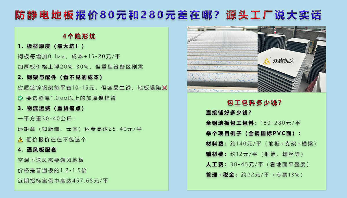 2026-04-15随着新基建项目的持续推进和机房建设旺季的到来,近期收到大量客户咨询:“防静电地板现在多少钱一平方?”“包工包料什么价?”“网上报价几十到几百都有,到底差在哪?”作为服务全国的源头厂家(众鑫机房),我们不报虚价,今天结合当前市场最新原材料动态